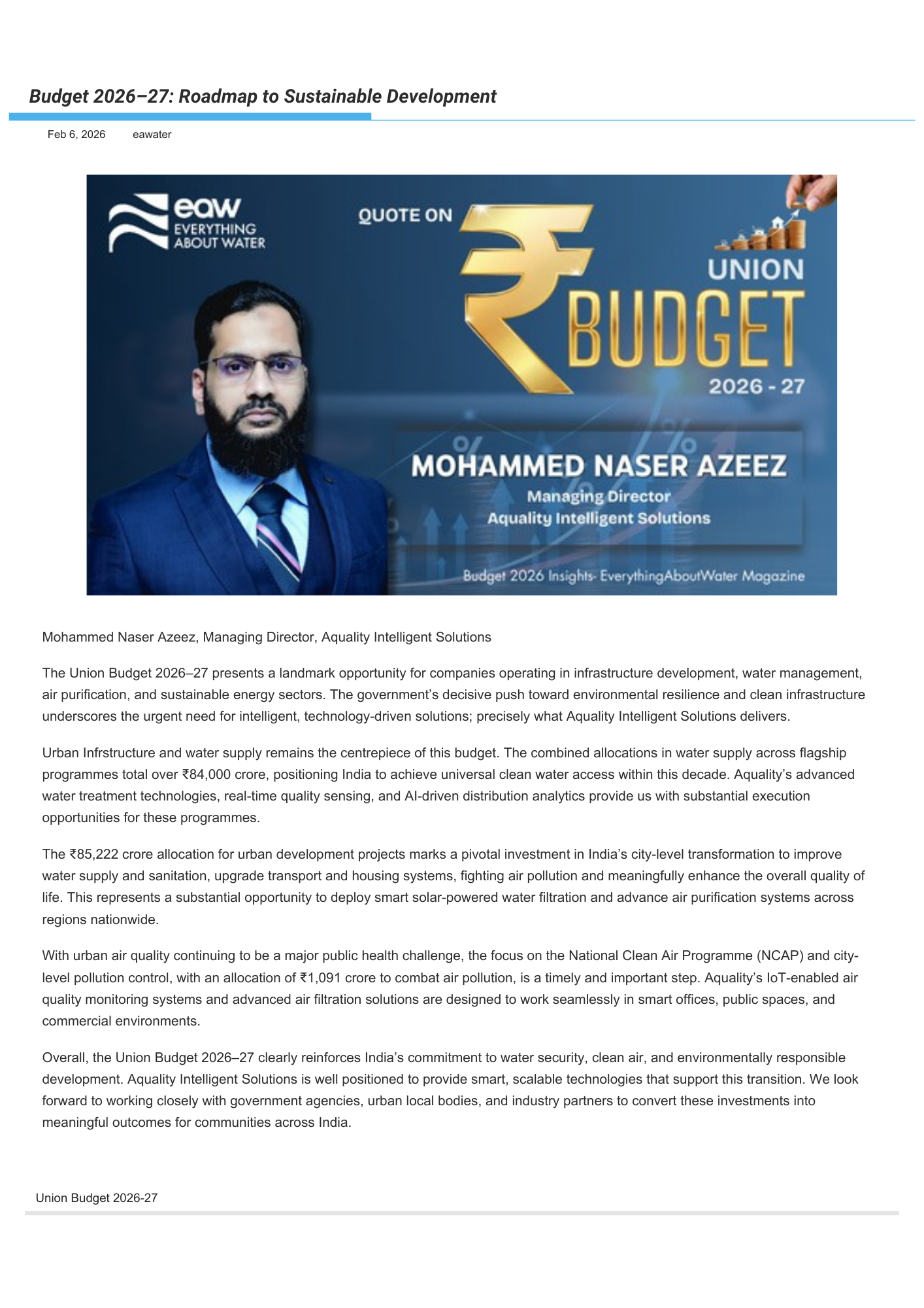 Insights on Union Budget 2026-27February 6, 2026 by aquality News Insights on Union Budget 2026-27Everything About Water, Feb 2026 Read More