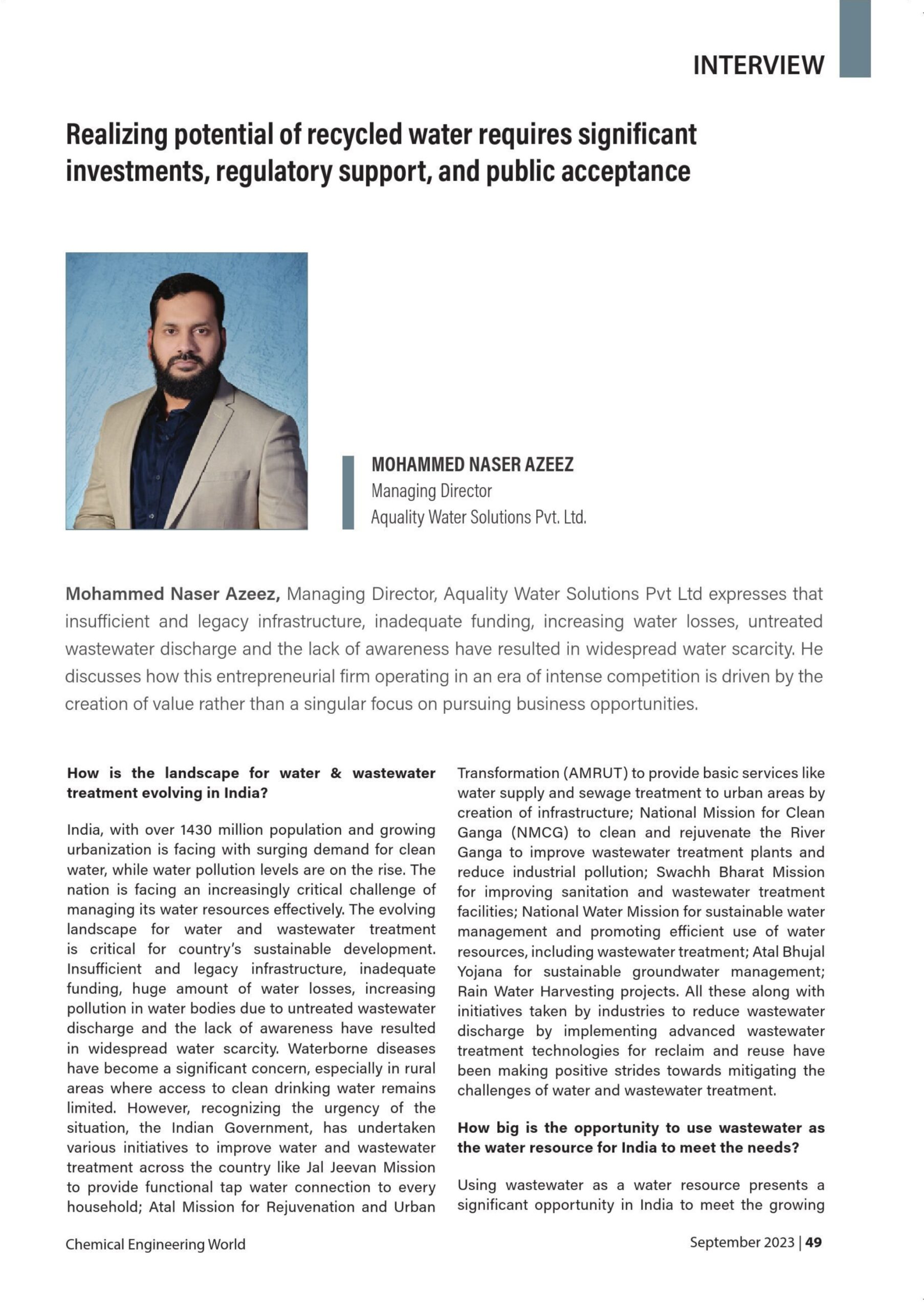 Interview of MD-AQUALITY on Water & Wastewater ManagementSeptember 1, 2023 by aquality News Interview of MD-AQUALITY on Water & Wastewater ManagementChemical Engineering World, September 2023 Read More