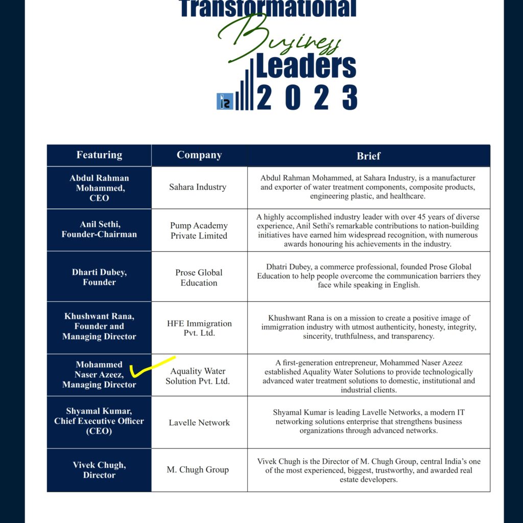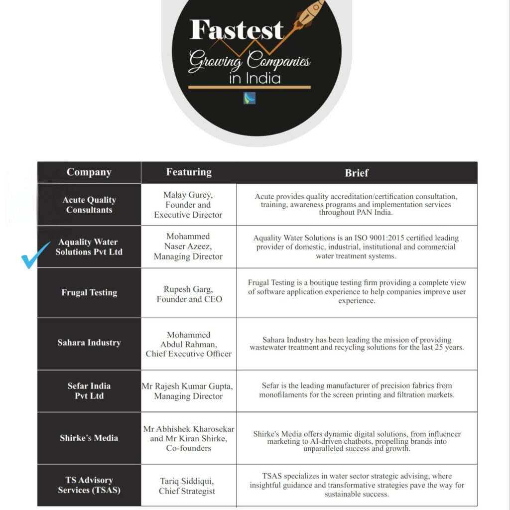 News Fastest Growing Company in India in 2023:AQUALITY November 1, 2023 Read More Interview of MD-AQUALITY on Water & Wastewater Management September 1, 2023 Read More Transformational Business Leaders of 2023: MD-AQUALITY August 8, 2023 Read More « Previous 1 2 3 4 5 6 7 8 9 10 Next »